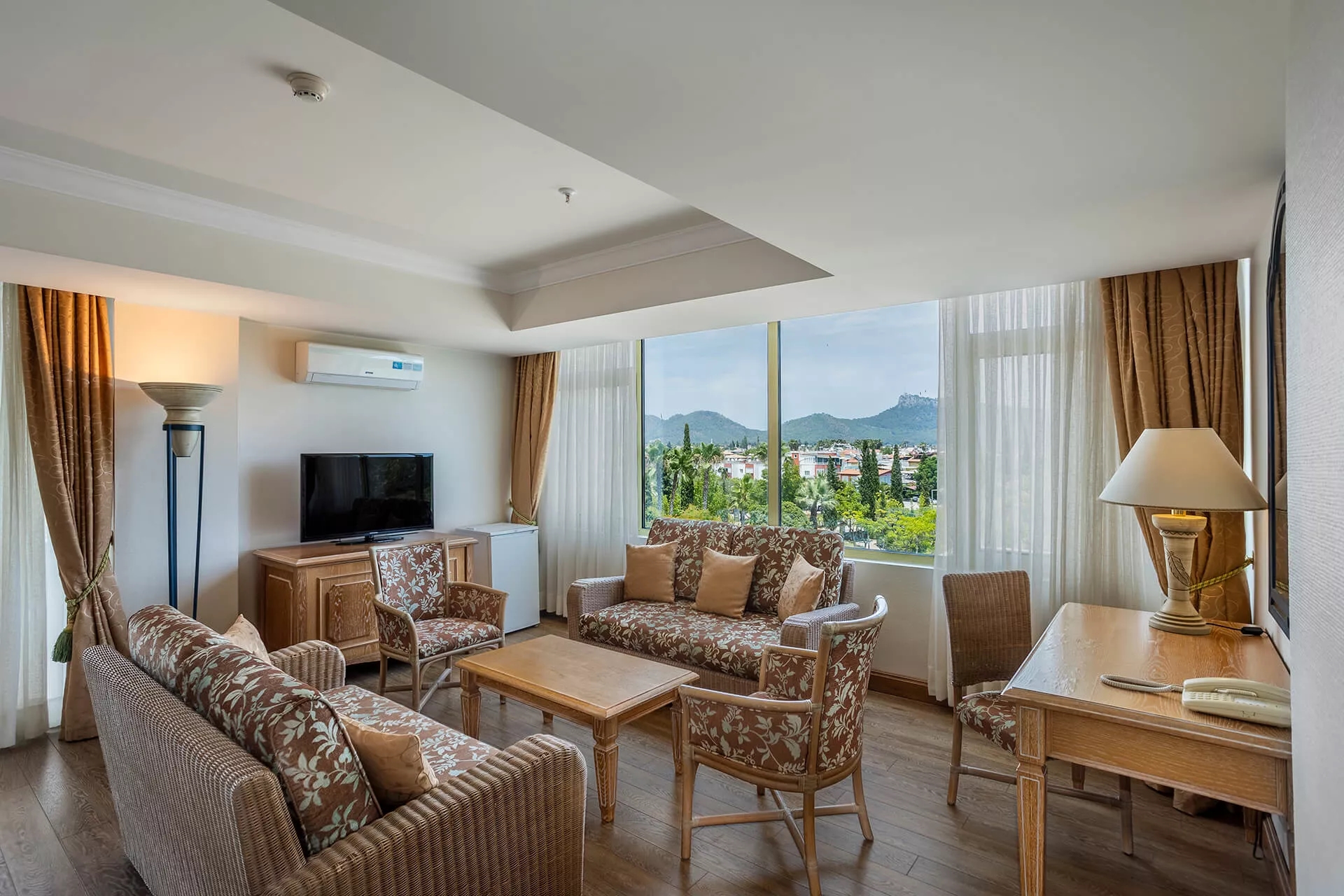 Otelimizin ana binasında yer alan deluxe suit odalarımız ara kapılı olup toplam 8 adettir.72 m² büyüklüğünde olan deluxe suit odalarımızda bir adet çift kişilik yatak + oturma grubu+ 1 banyo + 1 wc bulunmaktadır.